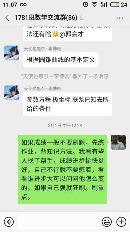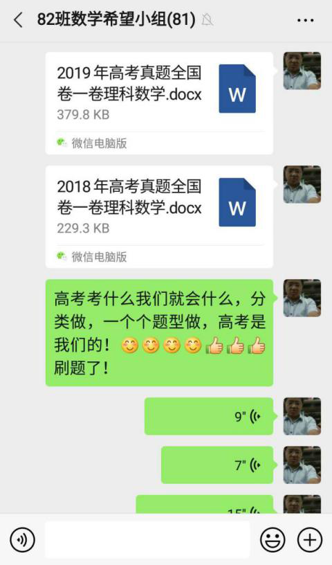 在班里,郭老师也建立了微信学习群,QQ学习群,学生在学习过程中有问题可随时提问。针对学生的疑问、高考重点题型、精选试题等,郭老师会在没有正课或自习的时间及时录制成讲解小视频,充分利用好微信,QQ群,进行讲解。