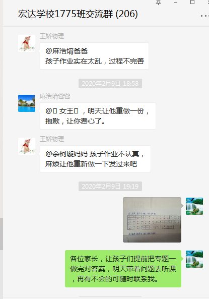 每天晚上及时批改学生的小鑫作业,记录典型错误,出错学生姓名,在群里@他们,重点提醒,及时改错。学生作业提交不及时的在群里提醒,优秀作业在群中展示表扬。