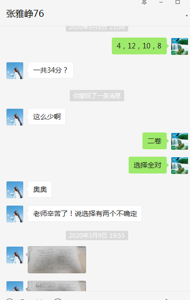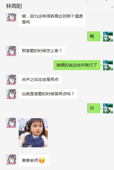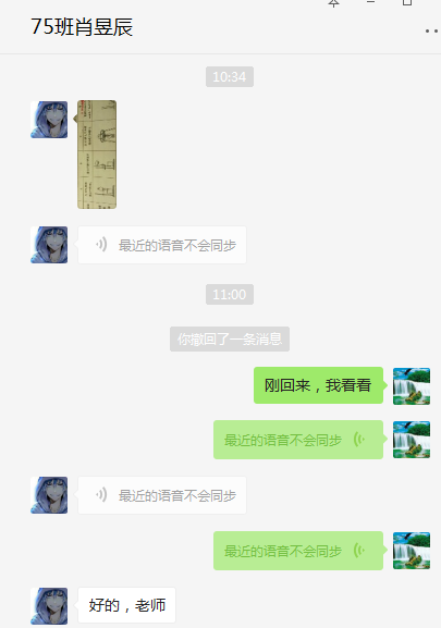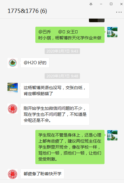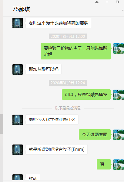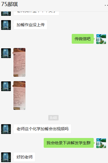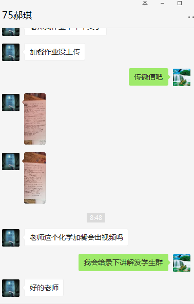 对重点学生,杨老师采取像是在学校一样一对一的辅导形式,分别添加学生的微信,对他们的个性问题单独解决,让学生们感觉有老师就在身边一样,有问题可以随时能问。比如:75班肖昱辰同学,非常喜欢化学,特别好问,从上午七点直到晚上十点,只要有问题,杨老师总是在第一时间回复,曾经数了一下,和他的交流有17屏!再如郝琪同学,当语音讲解不清楚时,杨老师就专门给她开视频讲解,在纸上做详细地分析解释。这样既有整体“面”上的统一要求,又有对个人“点”的单独指导,既保护了学生的学习积极性,也保证了学习效果。