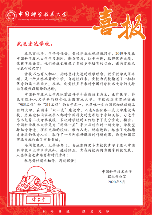 中国科学技术大学向我校发来喜报