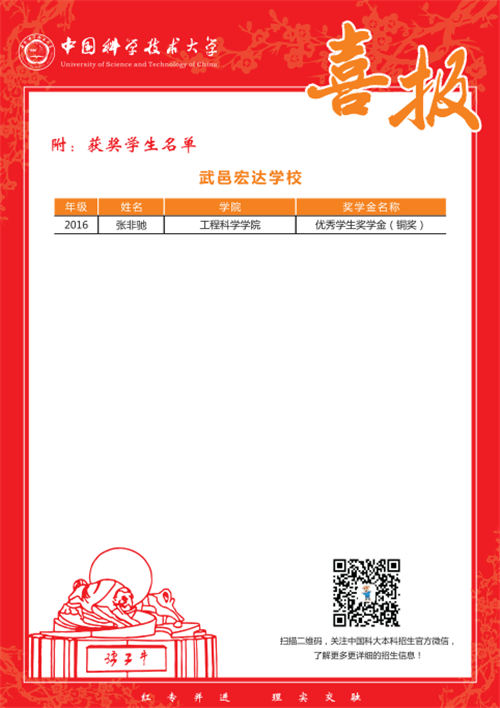 中国科学技术大学向我校发来喜报,祝贺我校优秀毕业生张飞驰同学在大学期间勤奋努力,红专并进,荣获学校优秀学生奖学金,希望我校更多优秀学子能进入中国科学技术大学求学致知、进德修业,两校共同为国家科技发展、人类社会进步培育新时代青年!