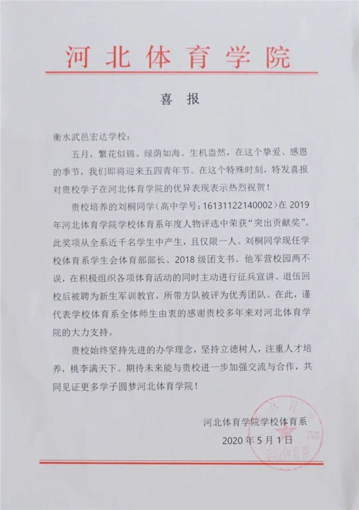 河北体育学院向我校发来喜报