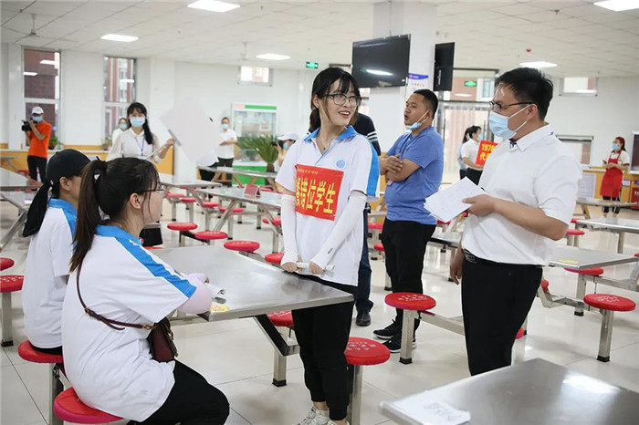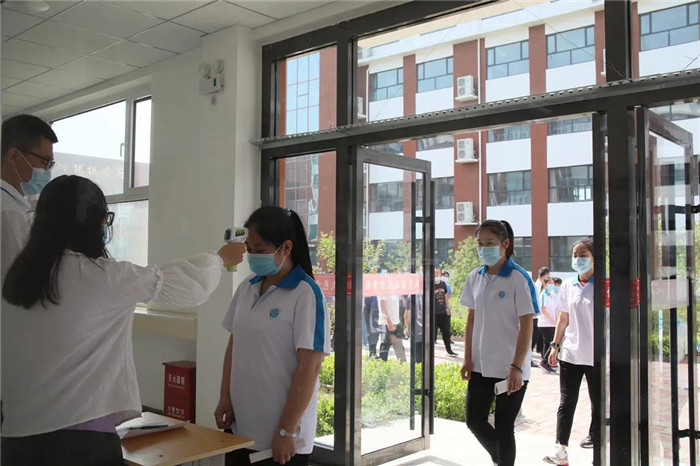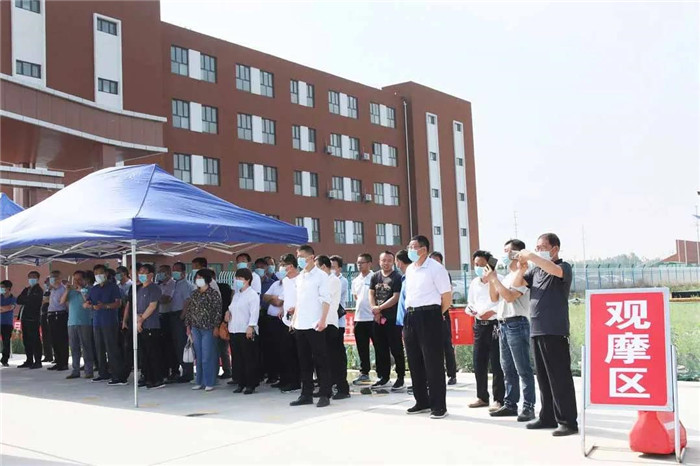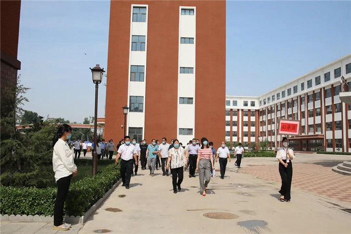 刘勇书记一行观摩了我校教职工模拟复学后学生错峰错时入校、通过单行通道进行体温检测手部消毒、入宿舍、入教室、课间活动、如厕、就餐等具体场景下的防控措施演练。