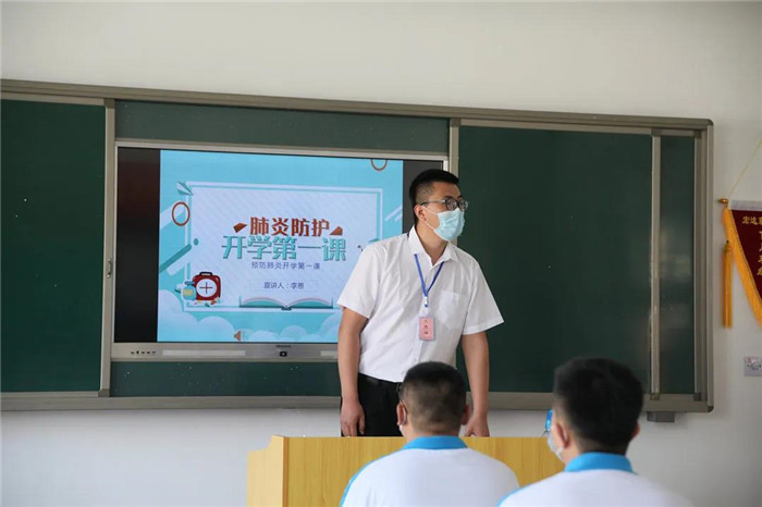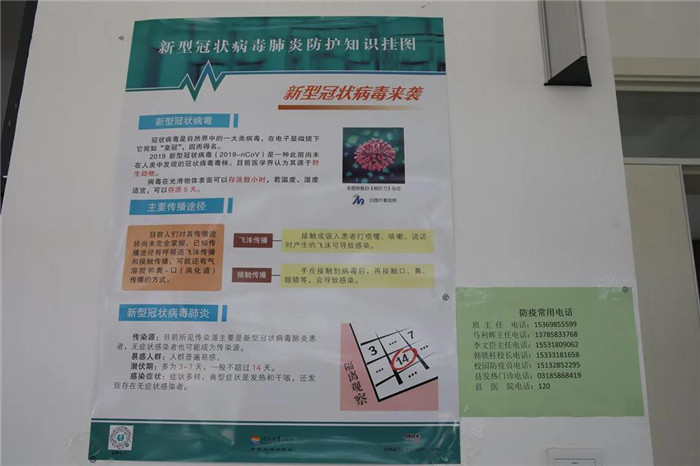 学生教室门口张贴新冠肺炎防护知识挂图及防疫常用电话