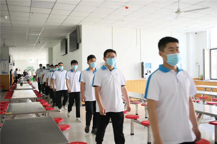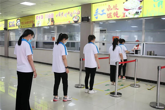 就餐完毕,学生间隔一米排队洗手,随后回宿舍休息