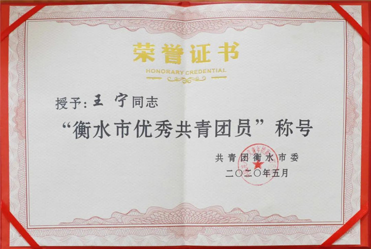 为集中展示新时代青年的精神品格和价值追求,加大关心关爱投身疫情防控一线团员青年,激励全市广大团员青年不忘初心、牢记使命,为全面建设“经济强市、美丽衡水”而努力奋斗,团市委开展了2019年度衡水市“优秀共青团员”评选表彰工作。我校王宁同学荣获“衡水市优秀共青团员”称号。
