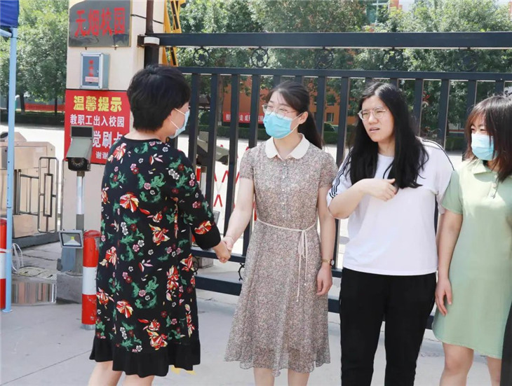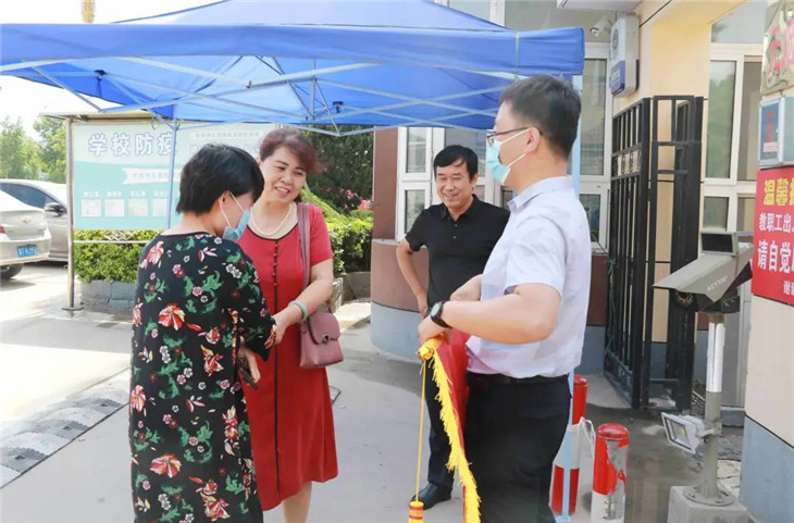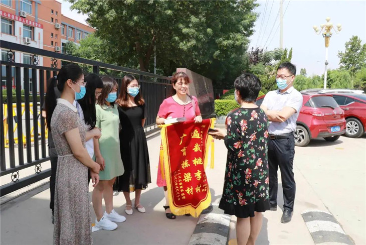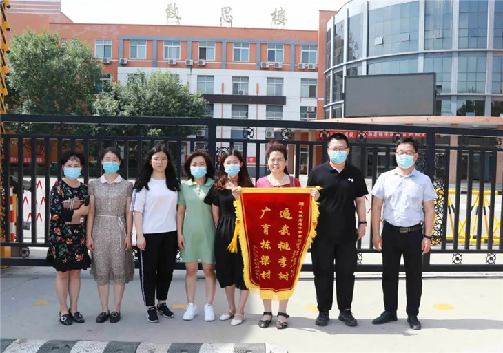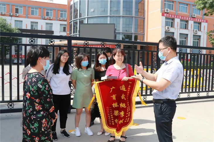 6月8日,我校高二年级1829班学生詹骏哲的家长来到学校,为班主任王秀华及1829班的全体老师送来了一面绣有“遍栽桃李树 广育栋梁材”的锦旗,我校高二年级主任张延华、班主任王秀华及1829班全体任课老师在校门口热情接待了学生家长。