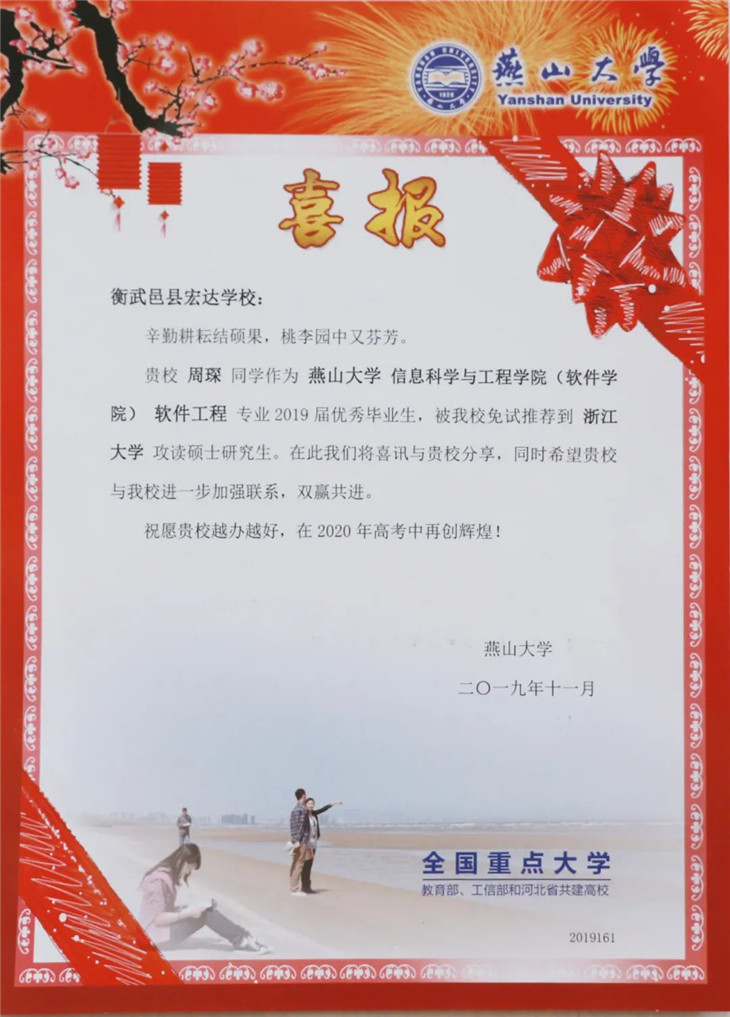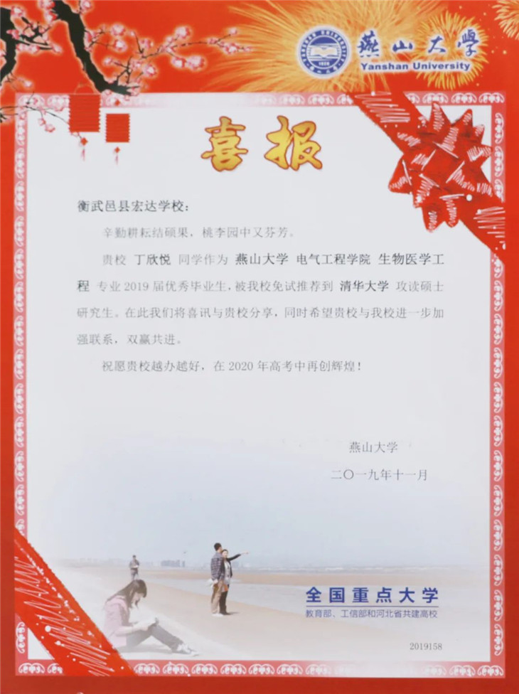 辛勤耕耘结硕果,桃李园中又芬芳。又是一年毕业季,有的同学选择就业,有的同学则选择考研,近日,燕山大学向我校发来喜报,祝贺我校优秀毕业生丁欣悦被免试推荐到清华大学攻读硕士研究生;优秀毕业生周琛被免试推荐到浙江大学攻读硕士研究生;优秀毕业生徐剑锋被免试推荐到天津大学攻读硕士研究生;优秀毕业生赵亚楠被免试推荐到燕山大学攻读硕士研究生,燕山大学与我校共同分享喜讯,同时希望两校能进一步加强联系,双赢共进,并预祝我校越办越好,在2020年高考中再创辉煌!