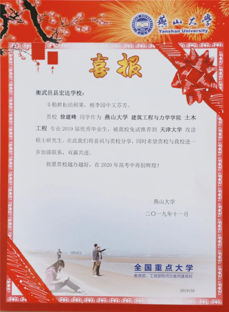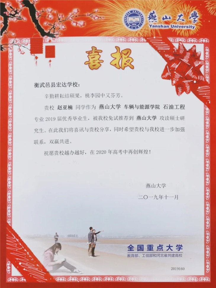 燕山大学向我校发来喜报