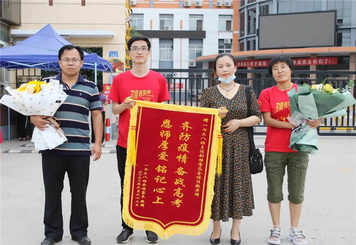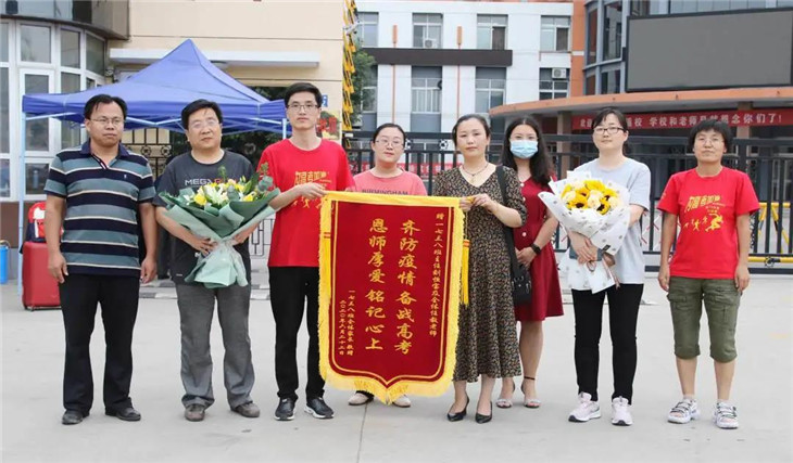 6月22日,我校高三年级学生家长代表来到学校,为班主任刘恒宝及1738班全体教师送来了鲜花和一面印有“齐防疫情 备战高考 恩师厚爱 铭记心上”的锦旗,以此感谢学校领导和任课老师的辛勤付出,我校高三年级主任邱雪、级部主任万冬雪、班主任刘恒宝及1738班全体任课老师在校门口热情接待了前来的家长代表。