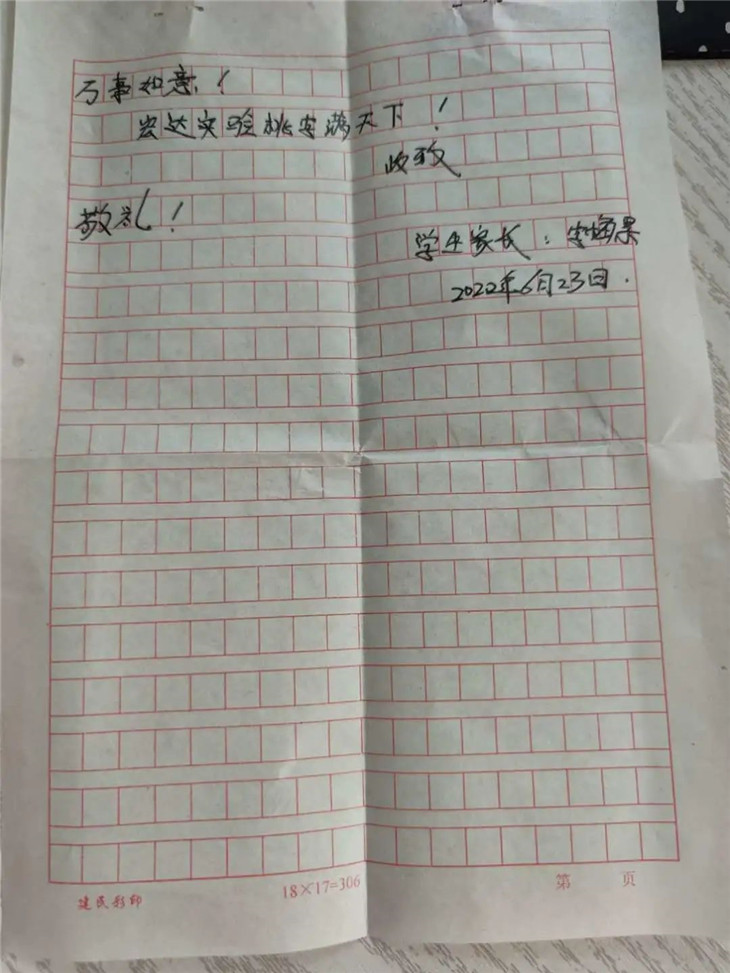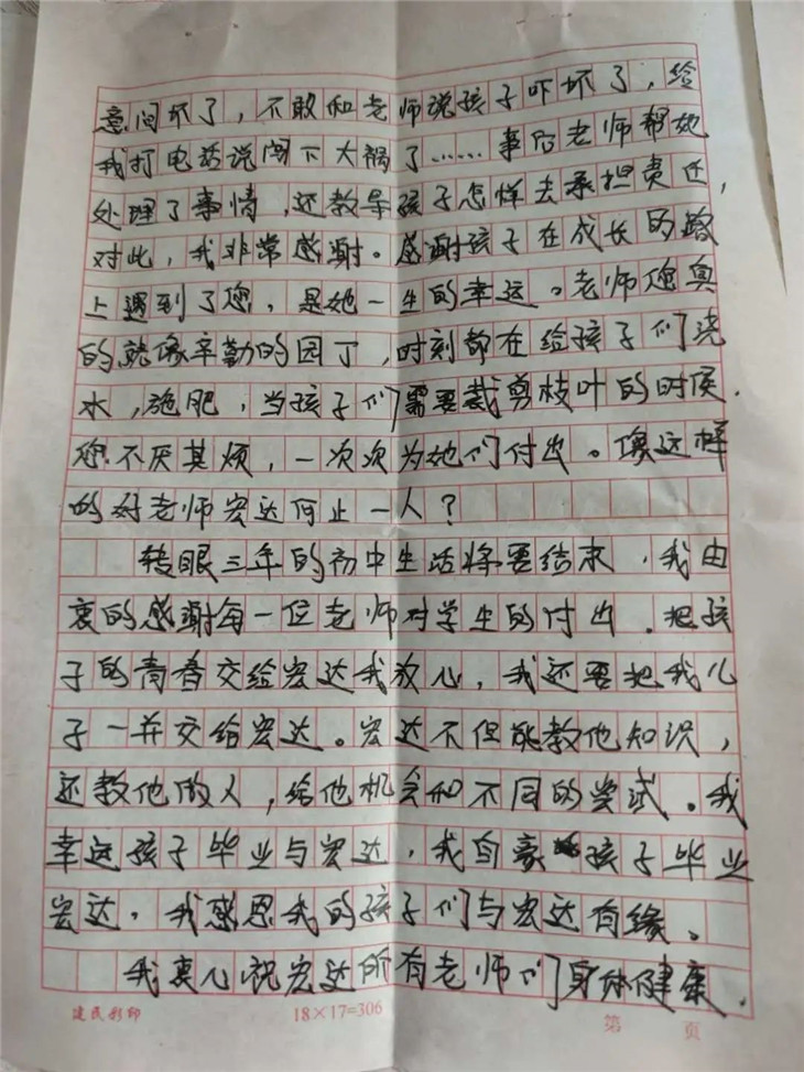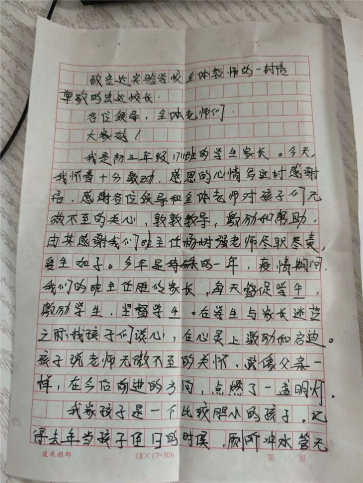 大家好!我是初三年级1711班的学生家长,今天我怀着十分激动和感恩的心情写这封感谢信。感谢各位领导和老师们对孩子们无微不至的关心、教导、激励和帮助,尤其感谢我们班主任杨树强老师,他尽职尽责、爱生如子。今年是特殊的一年,疫情期间我们的班主任胜似家长,每天督促学生、激励学生、监督学生,在学生与家长的迷茫之际主动找学生谈心,在心灵上启迪孩子。孩子说老师无微不至的关怀就像父亲一样在今后前进的方向为她点燃一盏明灯。