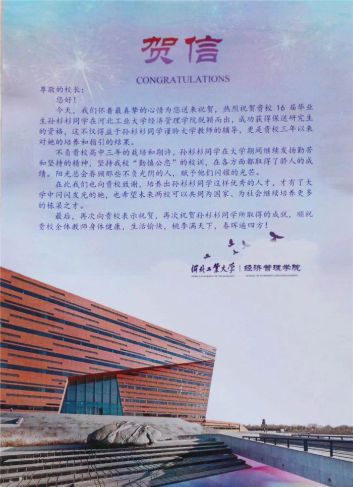 河北工业大学再次向我校表示祝贺,祝贺孙杉杉同学所取得的成绩,顺祝我校全体教师身体健康,生活愉快,桃李满天下,春晖遍四方!