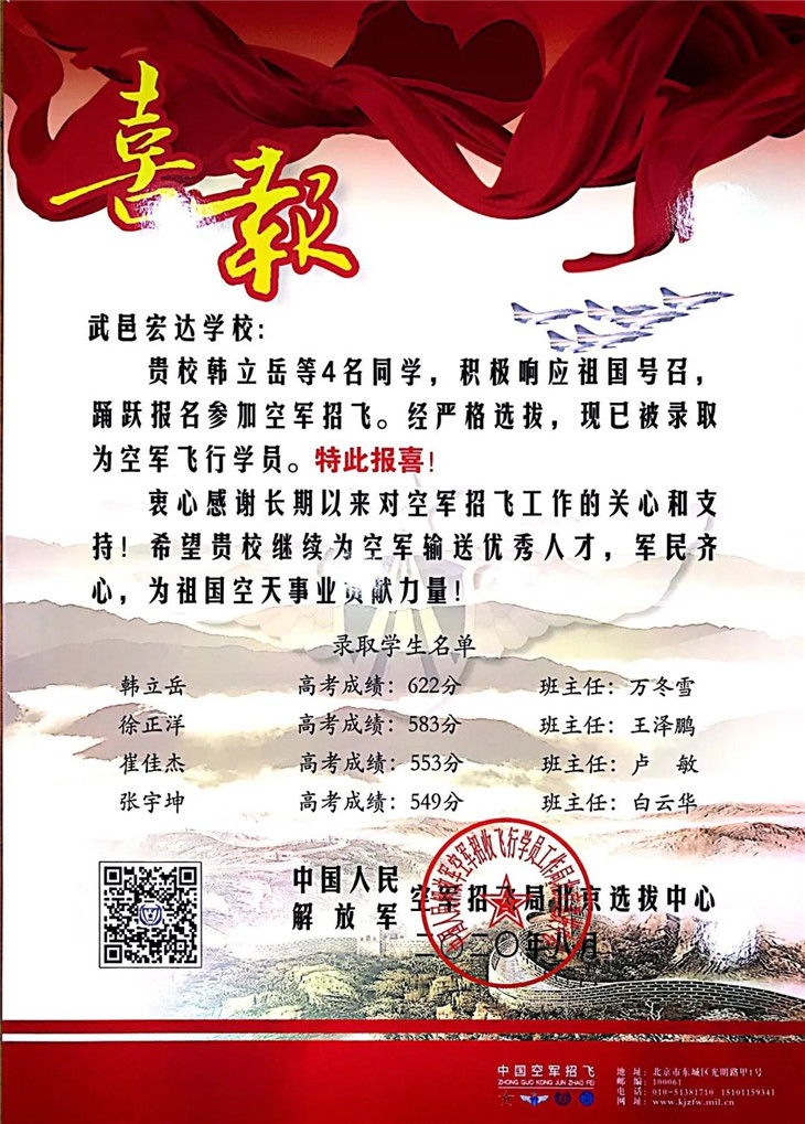 近日,我校收到空军招飞局北京选拔中心喜报,祝贺我校韩立岳、徐正洋、崔佳杰、张宇坤4名考生被中国人民解放军空军航空大学录取,成为了光荣的飞行学员。