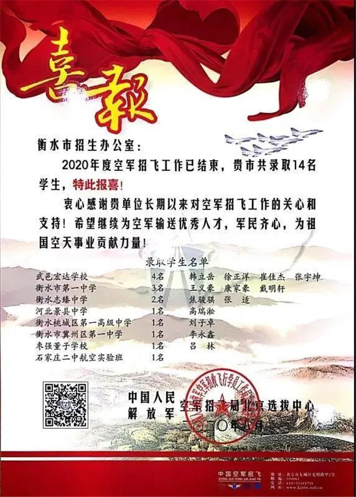 据了解,空军航空大学招生过程严苛,对身体素质和文化素质都有很高的要求,应考生需要经过严格的选拔,最后才能“笑傲江湖”。今年招飞,衡水市仅录取14名学生,武邑宏达学校学校就占了四人。