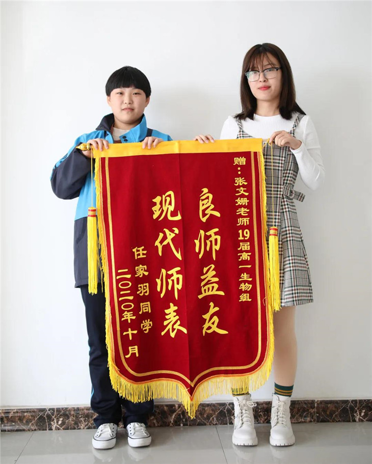 高一年级生物组张文珊老师收到任家羽家长赠予的锦旗。