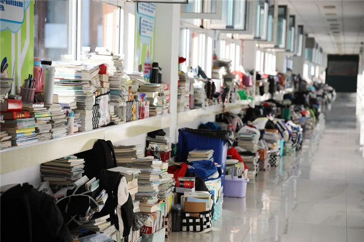 走廊里整齐的码放着同学们的书本,这形成了历来考试中一道独特的风景。