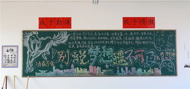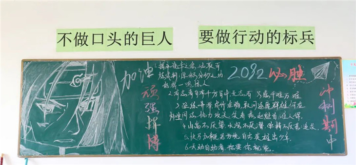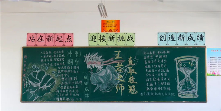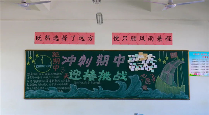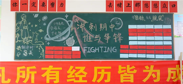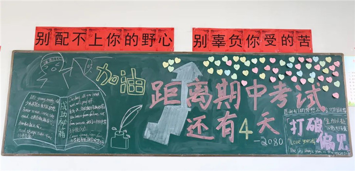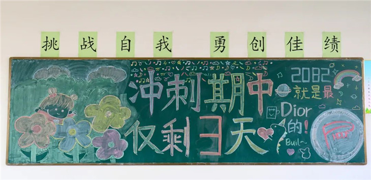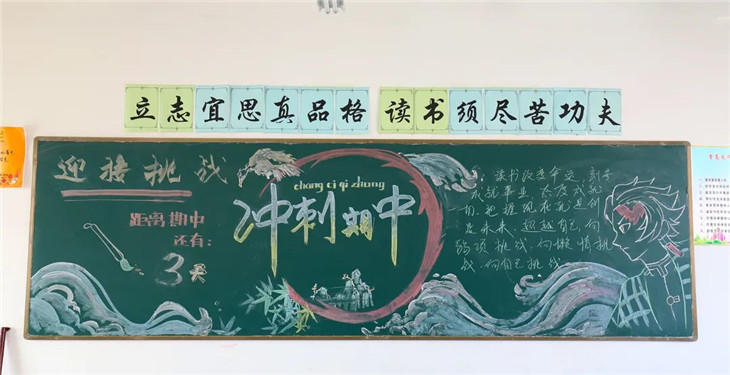 校园是教书育人、文化传承的场所,为了迎接这次期中考试,各班在班主任带领下绘画了黑板报,上面表达了孩子们对自己严格要求,奋勇争先的愿望,在板报中每天都会更新考试倒计时时间,时刻提醒学生,激励学生积极备战,营造良好的学习氛围。