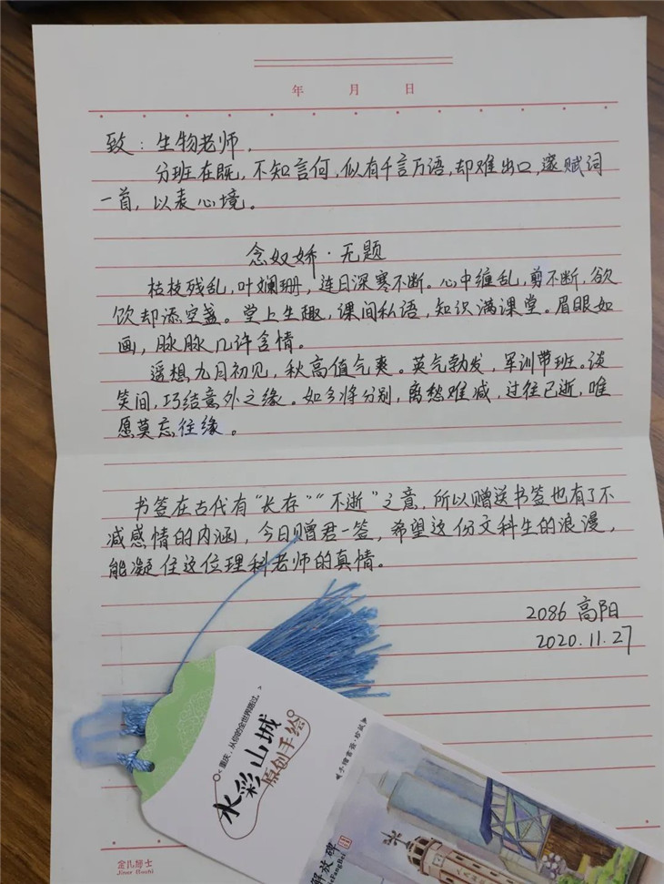 昨日宏达东方高一年级全体师生顺利完成学科组合分班,分班之际,小编看到很多的孩子向自己的老师道别,送小礼物的,写记念纸条的,拥抱老师的,小编看到很是受感动,一方面因为孩子成长了,懂事了而感到欣慰,另一方面也因为分别而略有伤感。很是欣慰也很惊讶的是有个孩子竟然拥抱了我一下,谢谢我们记录下高中最美的时刻,问叫什么,我说我只是你们青春的记录人。