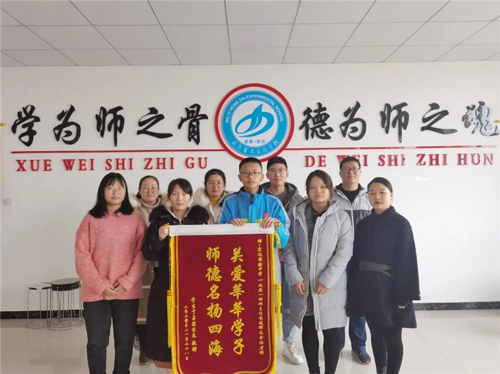 2020年的感恩节。对1901班的教师来说,有些不一样。因为他们收到了一份特别的礼物——来自1901班于占霖同学的家长送来的一面锦旗。