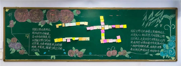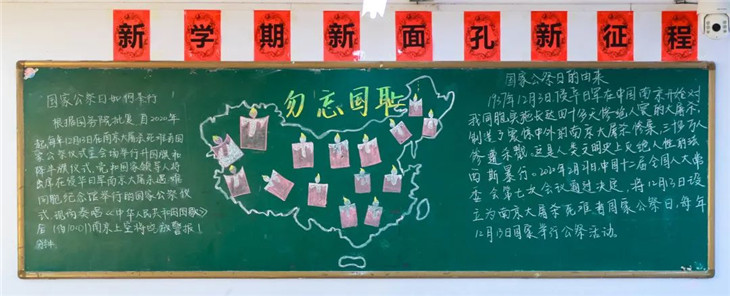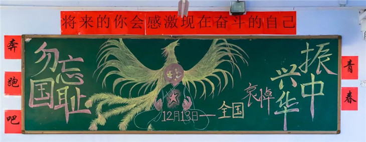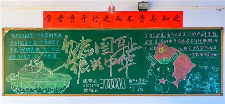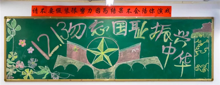 2020年12月13日是第七个南京大屠杀死难者国家公祭日,为悼念在南京大屠杀中死难的同胞和为祖国牺牲的革命英烈,引导我校师生继承先烈遗志,为实现中华民族伟大复兴的中国梦贡献出自己的一份力量,武邑宏达学校高一年级组织“勿忘国耻、圆梦中华”主题黑板报设计制作。