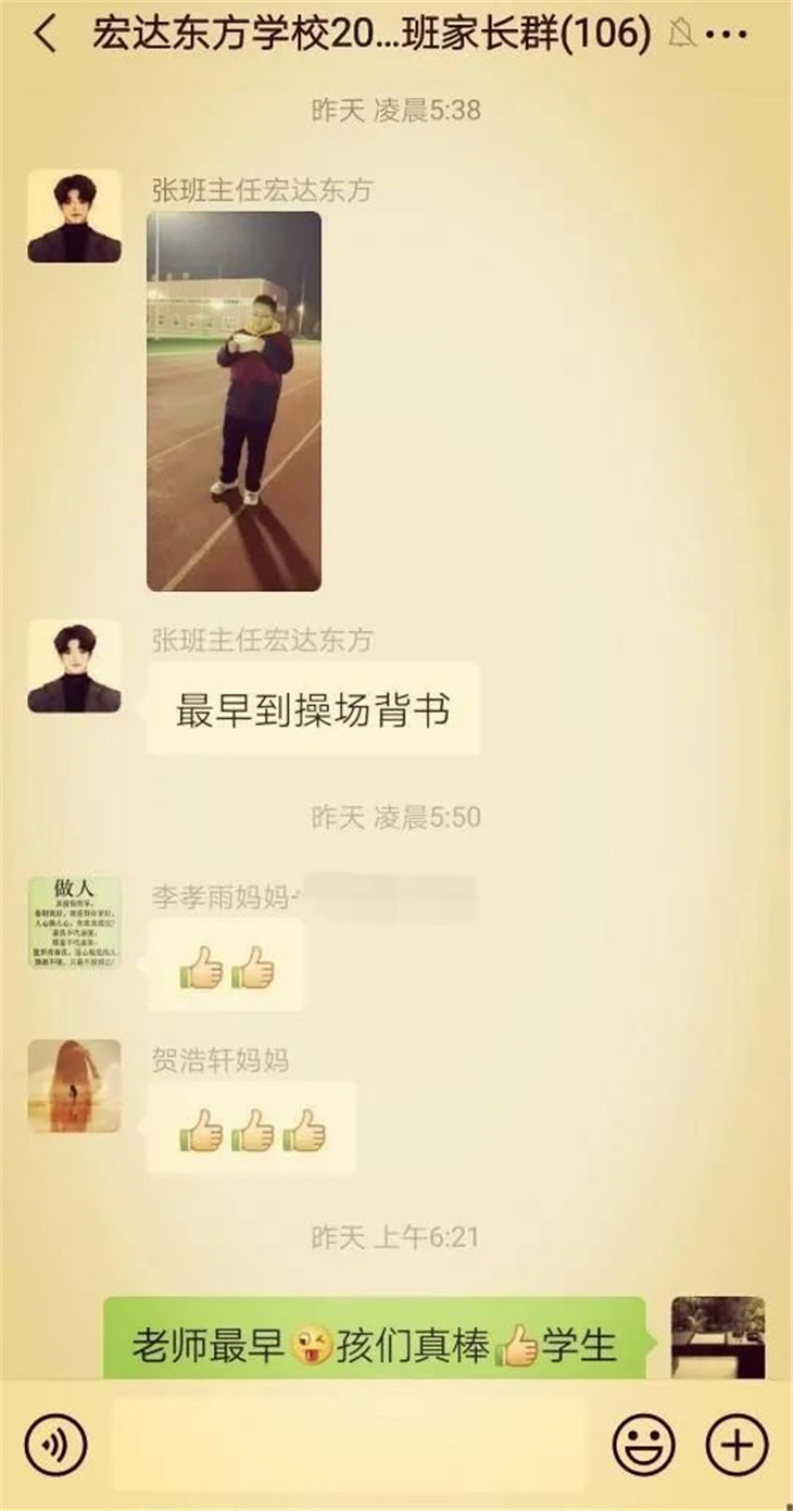 “他们晚上睡着了我才会离开宿舍,早晨他们一睁眼就能看到我,放心吧!”这是班主任张老师对家长们一句朴实的慰藉,又像是一个庄严的承诺。从晨光熹微到暮色降临,班主任整整陪伴孩子们一天,晚上11点多还在群里回复家长。孩子的成长历程里,不知道凝聚了老师多少心血和汗水。