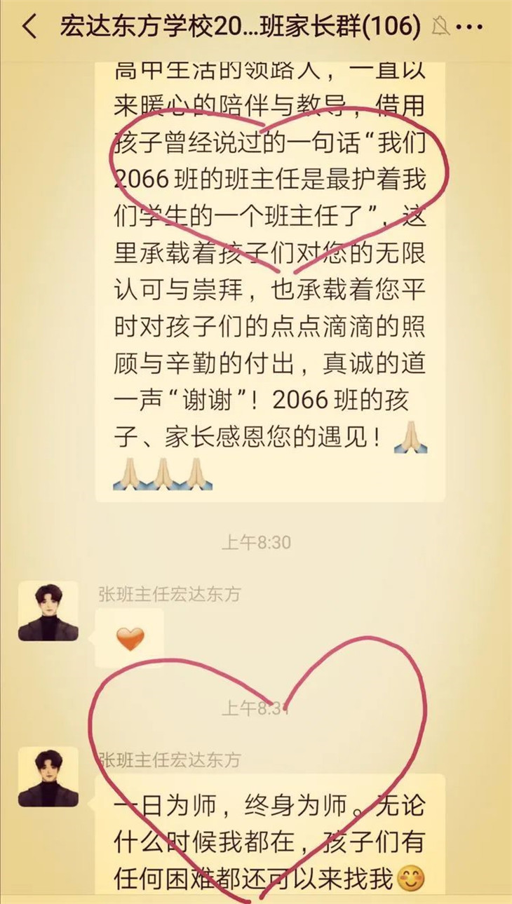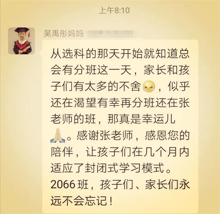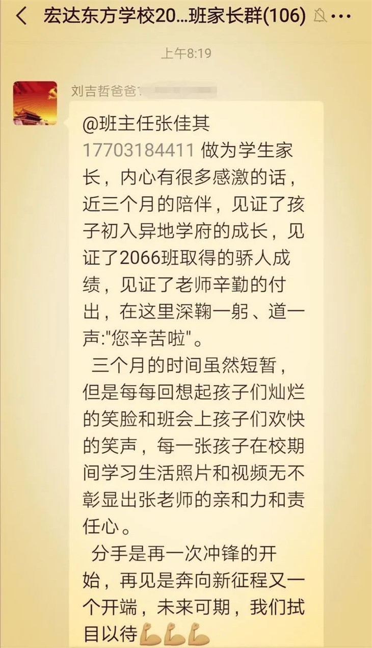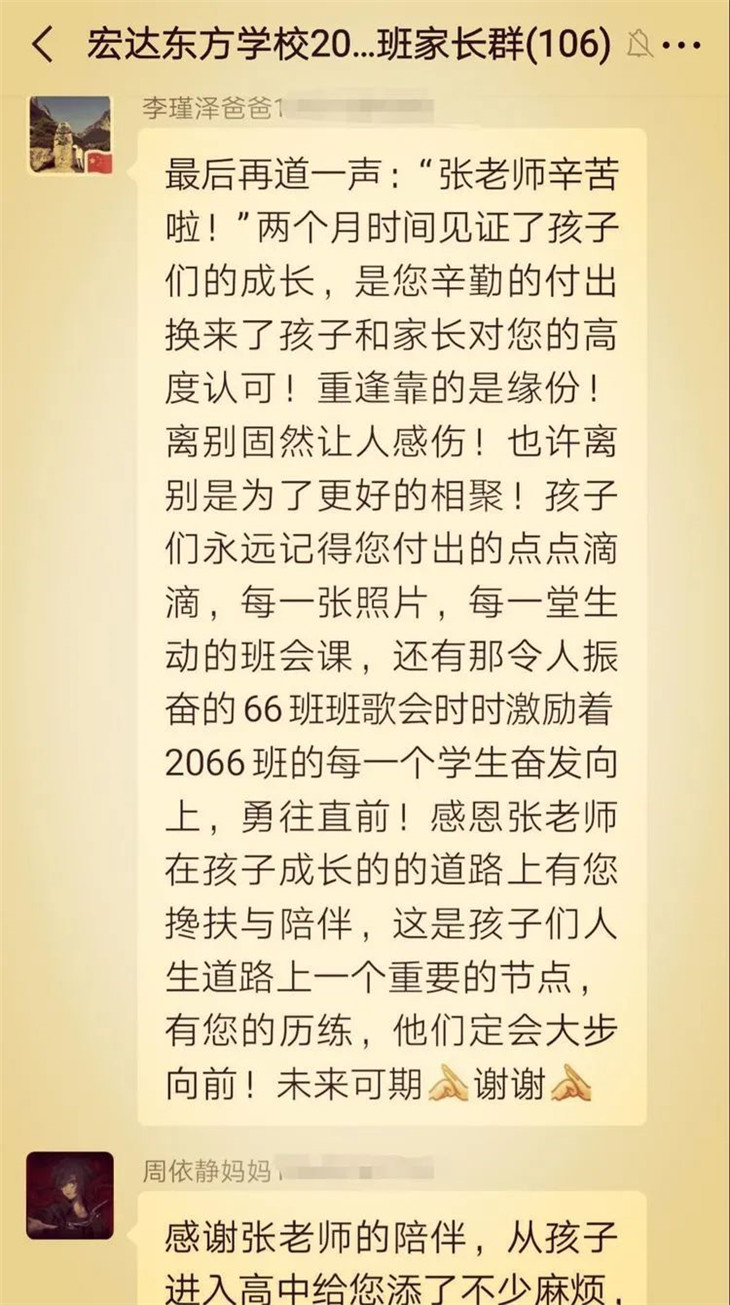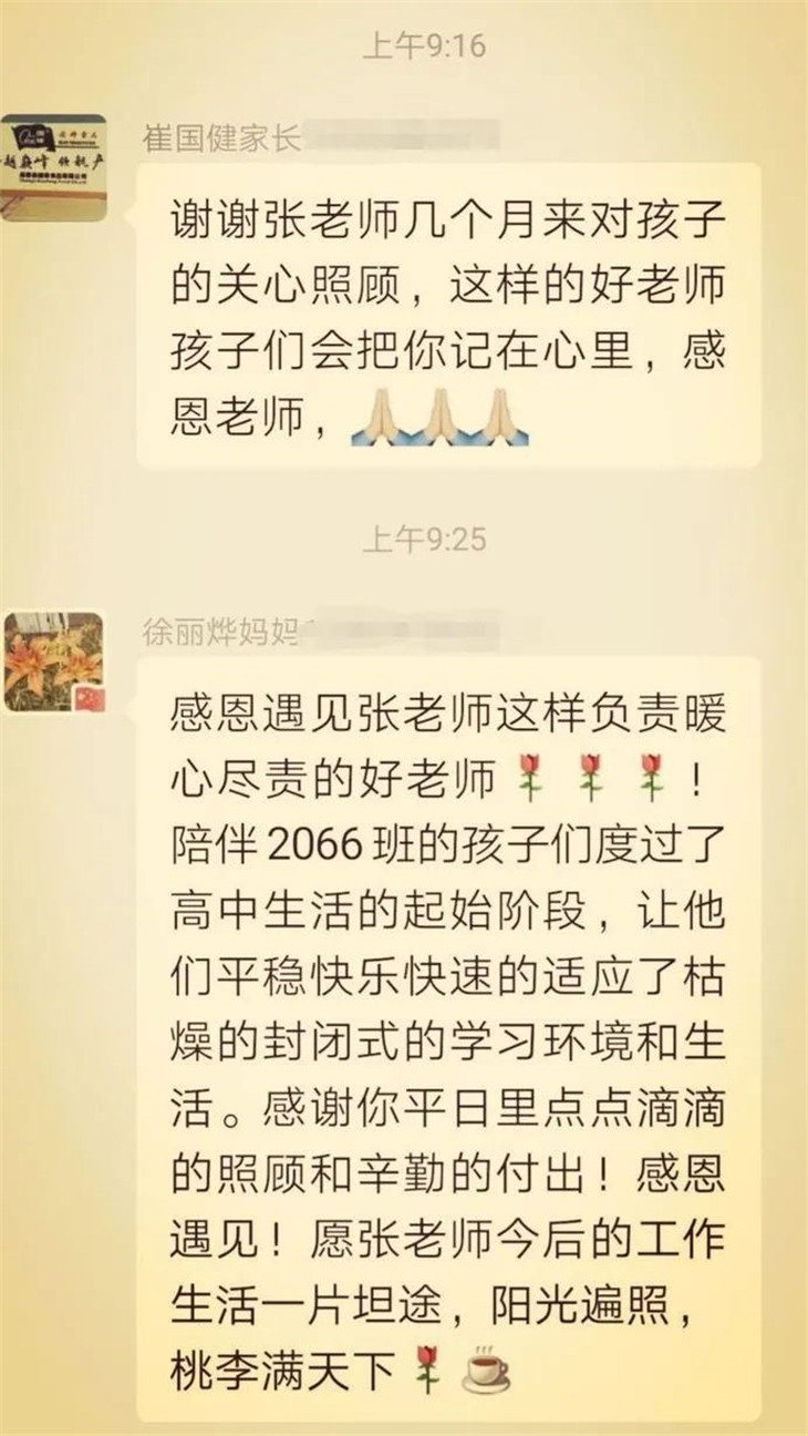 学生家长再次表示孩子点点滴滴的改变都离不开老师的细心关照,感谢学校为孩子们提供的优质教育,感谢原2066班班主任张老师对孩子的精心培养和全心付出。