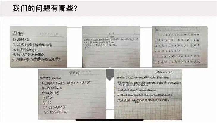 课前,董老师对同学们自制力存在的问题进行了调查,并让学生们将“发现问题我们应该如何去做?”写到纸上。课上,将搜集好的信息展现在大屏幕上,以便学生们更清楚地认识到自身存在的问题。
