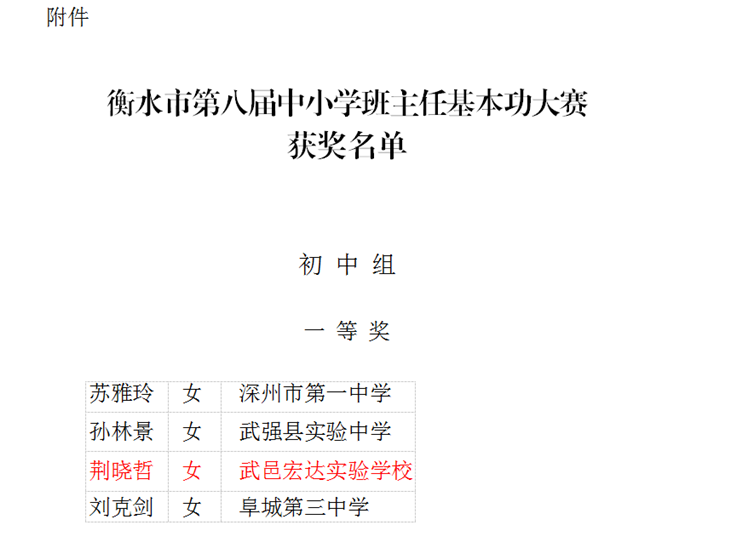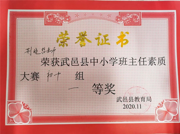 我校荆晓哲老师荣获衡水市班主任素质大赛一等奖、武邑县班主任素质大赛一等奖;
