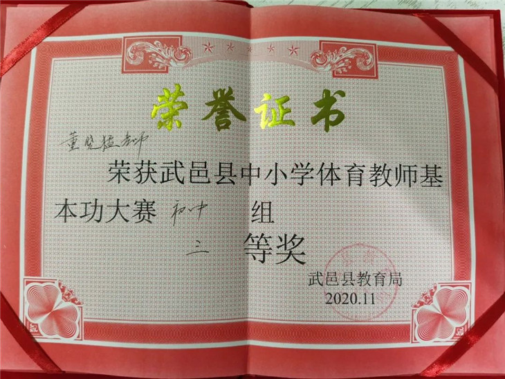 董晓猛老师荣获武邑县班主任素质大赛一等奖;武邑县中小学体育教师基本功大赛初中组三等奖。