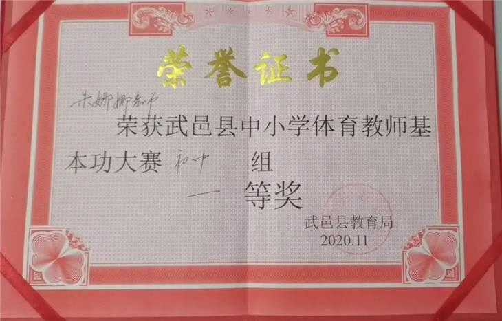 朱娜娜老师荣获武邑县中小学体育教师基本功大赛初中组一等奖;