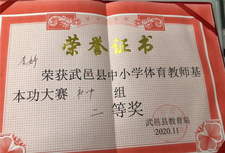 李婷老师荣获武邑县中小学体育教师基本功大赛初中组二等奖。