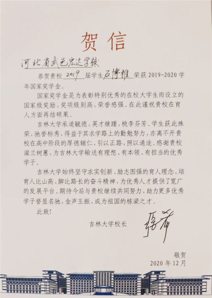 国家奖学金是为表彰特别优秀的在校大学生而设立的国家级奖励,奖项级别高,荣誉感强。我校2019届学生石博雅荣获2019-2020学年国家奖学金,吉林大学特发来喜报祝贺我校在育人方面再结硕果。
