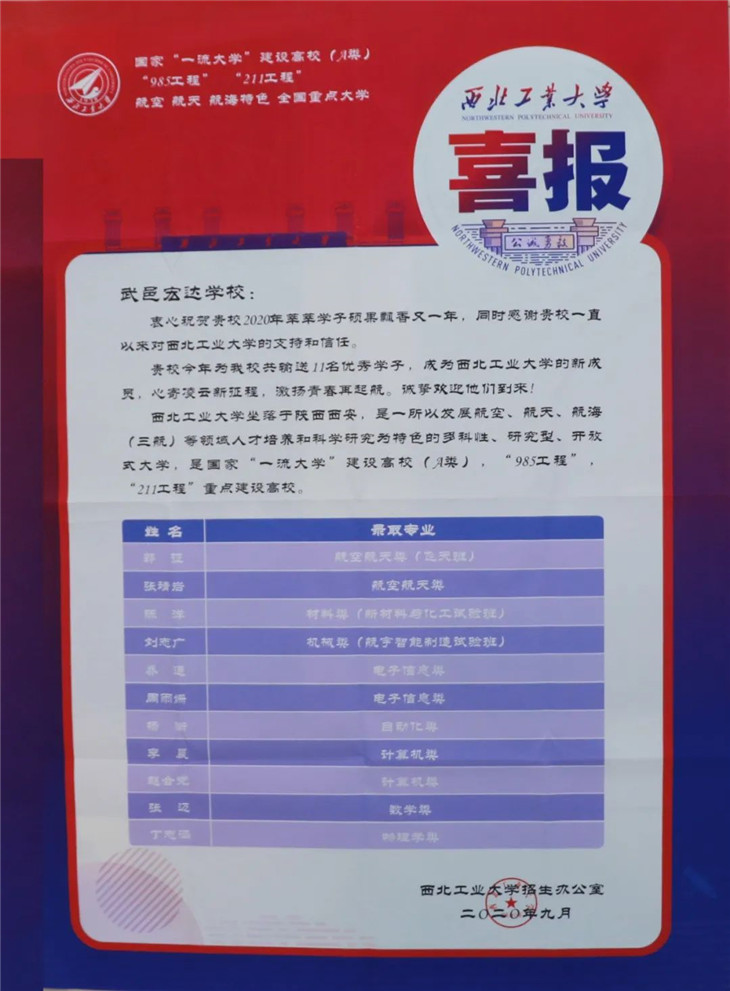在2020年高考中,我校11名优秀学子被西北工业大学录取,西北工业大学特向我校发来喜报表示祝贺,希望两校加强合作和交流,为国家拔尖创新人才培养做出更大贡献!
