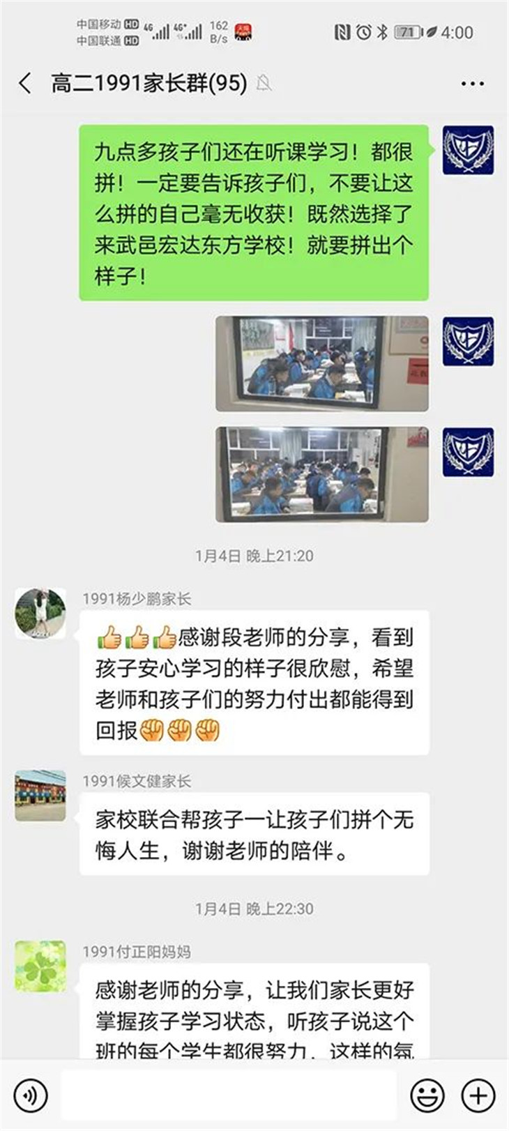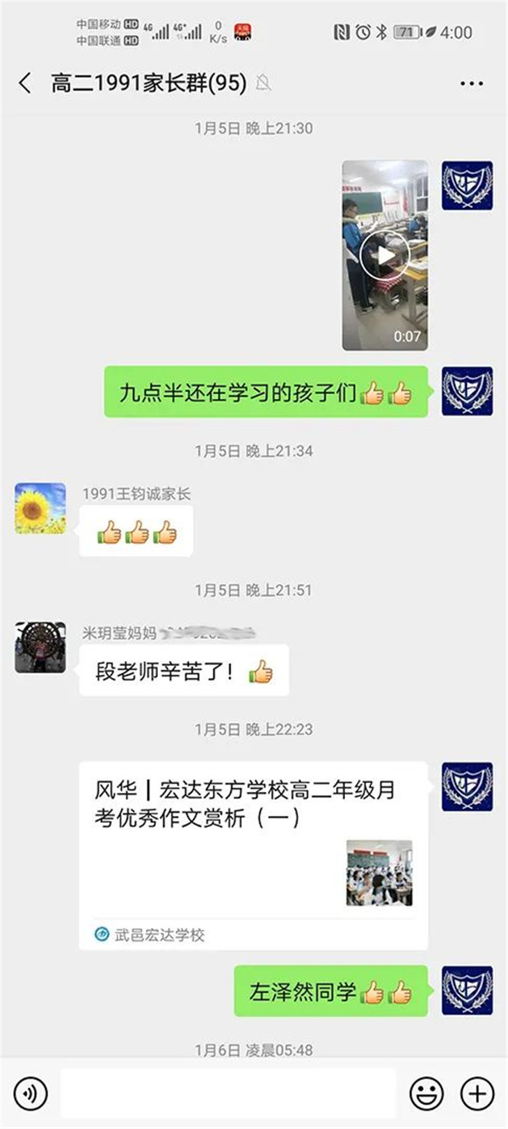我是高二年级1991班杨中霖的家长。杨中霖是来自秦皇岛的学生,带着对孩子的美好未来的期待,我把孩子送到武邑宏达东方学校就读。感谢贵校领导和老师,为千里求学的学子们创设优美的校园环境和良好的学习氛围。我还想借此机会,特别感谢1991班的班主任段兆宇老师。