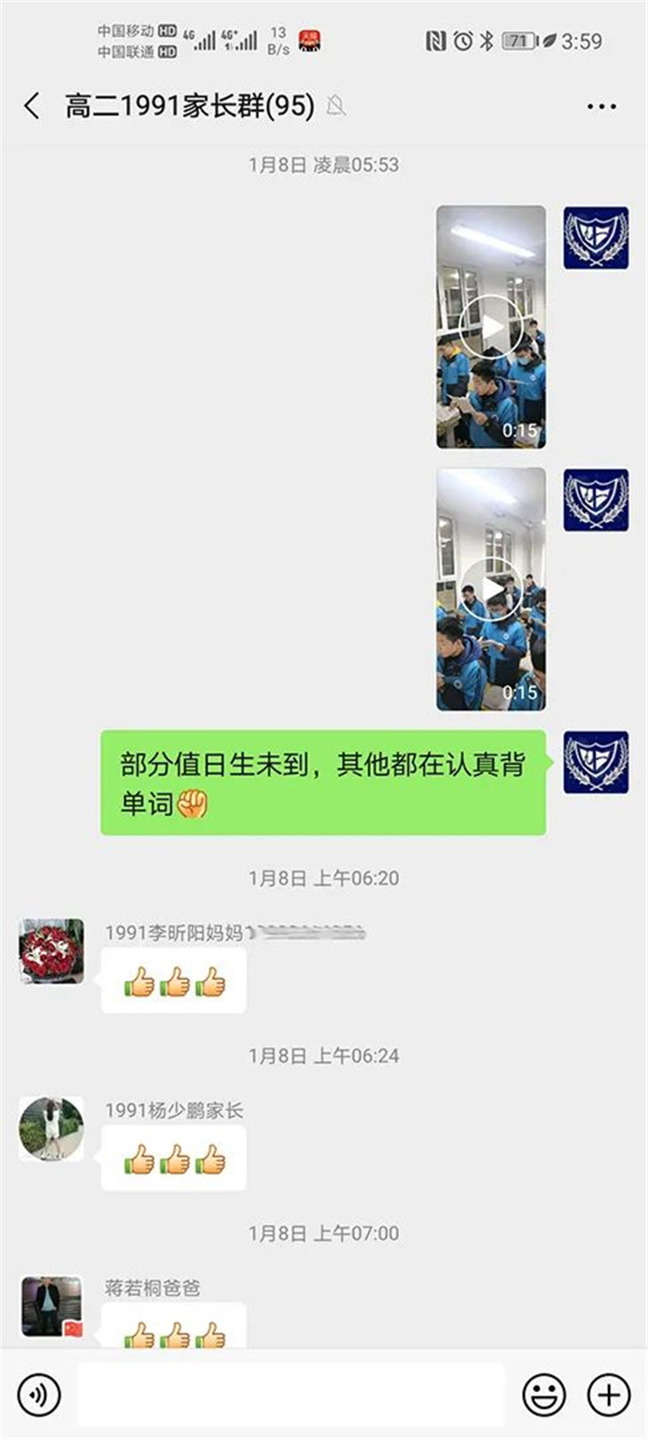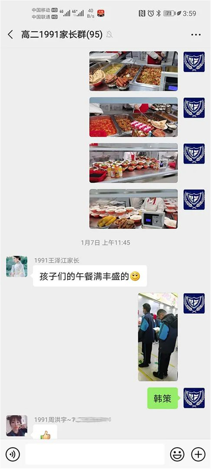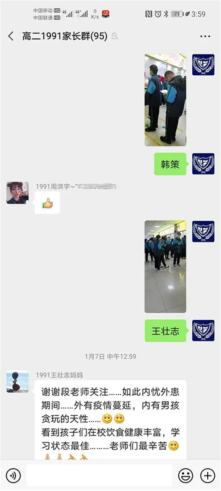 段老师,年轻却不失细心,每天都会在家长群里给家长报告学生的状态。教室里早晚努力学习的孩子,打饭值班中餐厅认真记知识点的孩子,还有父母最关心的孩子们的用餐情况,都被暖心的段老师用手机镜头一一捕捉。