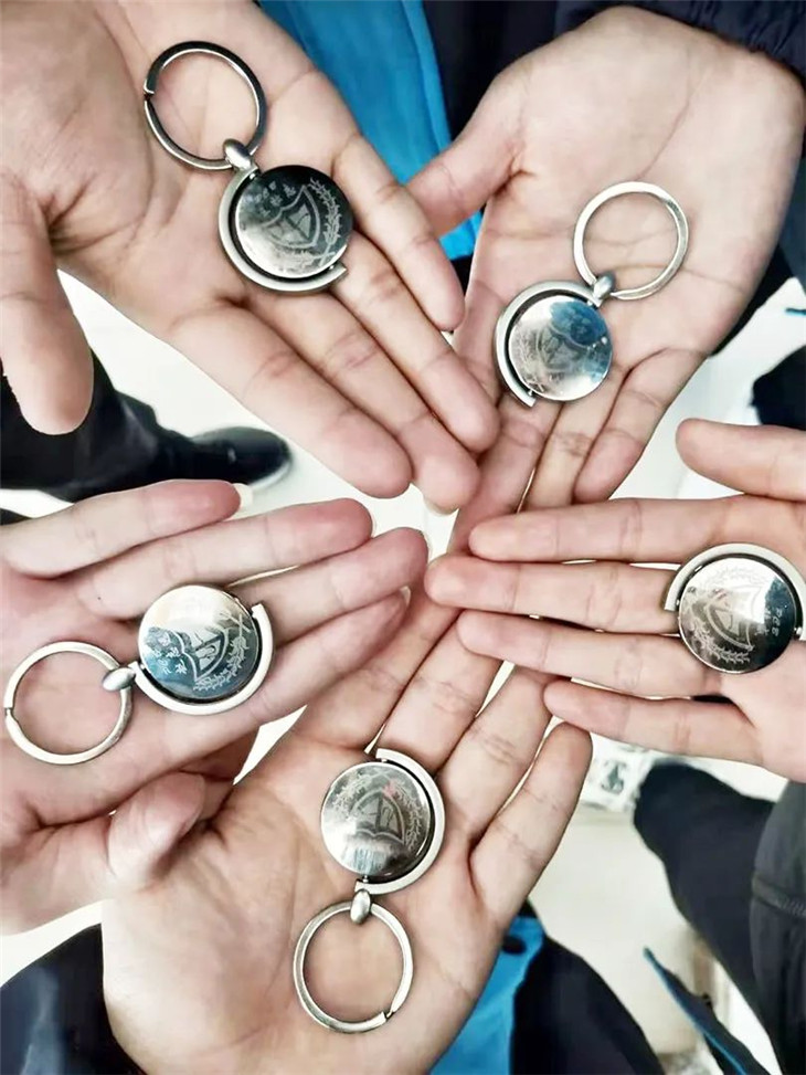 段老师自己设计了班徽,并给班上的同学特别定制了印有班徽和自己名字的钥匙扣,增加了同学们的集体归属感。