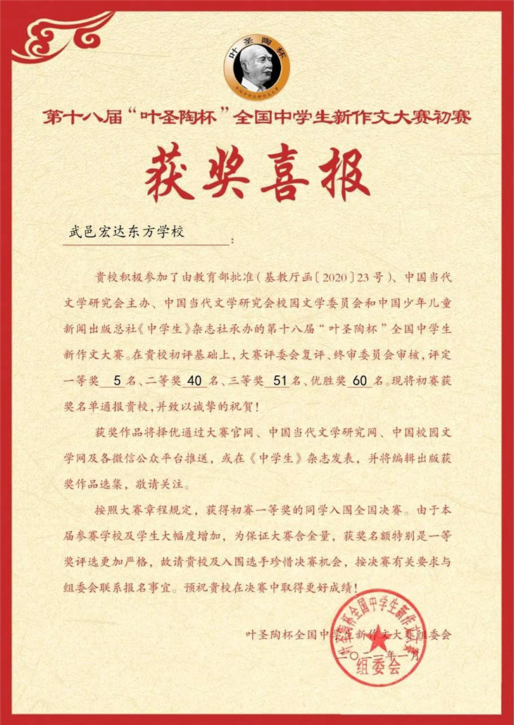 武邑宏达东方学校在第十八届“叶圣陶杯”全国中学生新作文大赛中喜获丰收!