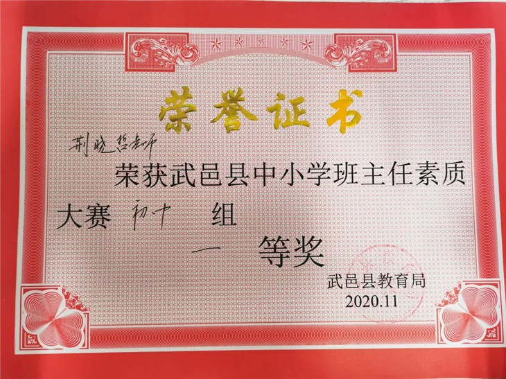 荆晓哲老师自任教以来一直担任班主任工作,她工作兢兢业业,踏实勤奋,任劳任怨,对学生认真负责,教育方法得当,积累了丰富的班级管理经验。并且在今年衡水市和武邑县举办的的班主任素质大赛中,取得初中组一等奖的佳绩!但是她深知学无止境,在班级管理上不断提高自己的水平,总结管理经验。