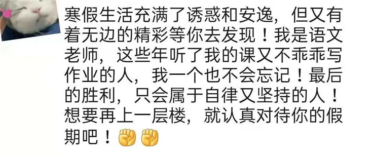 放假前关于学生的朋友圈是这样的:“自弃者扶不起,自强者击不倒”,满是鼓励的话语。同学们的自律,更让老师们感到很欣慰。这一年以优秀结尾,我们的东方少年都是好样的!