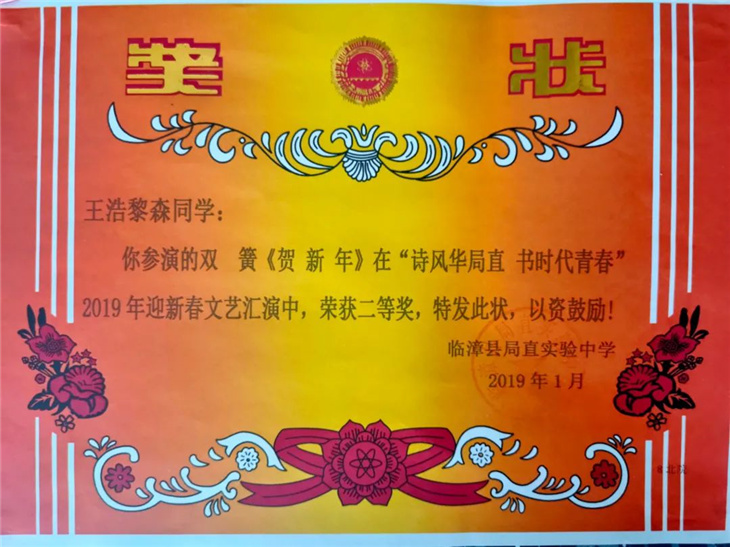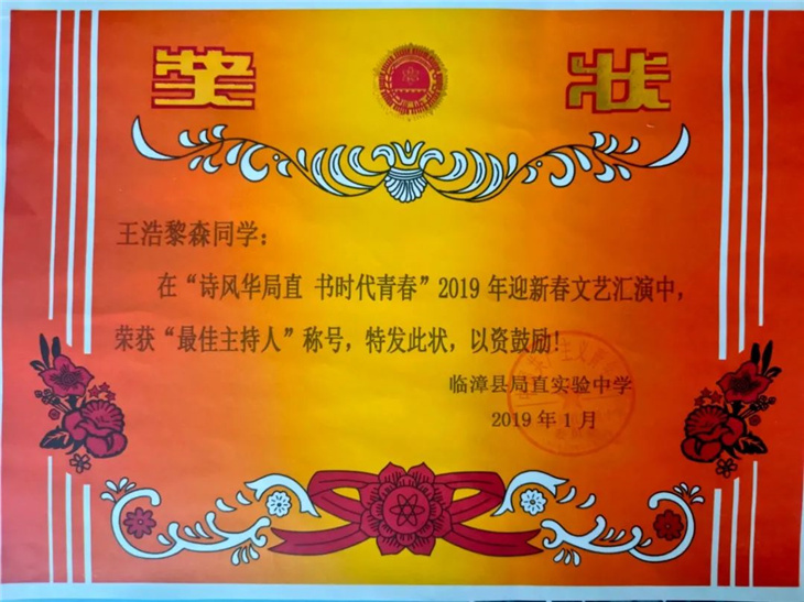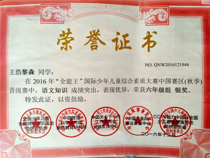 王浩黎森拥有积极向上的生活态度和广泛的兴趣爱好,语文作文比赛,校园新春晚会小主持人,迎新春文艺汇演等,他努力提升自己语言口语水平,在中国少年先锋队地区比赛获得了银奖。他还学习跆拳道强身健体,参与社会志愿者活动,参加文明创城工作,为文明社会建设发光发热,在社会实践和团体协作方面积累了经验,提升了自己,提高了自己的道德修养和思想认知。