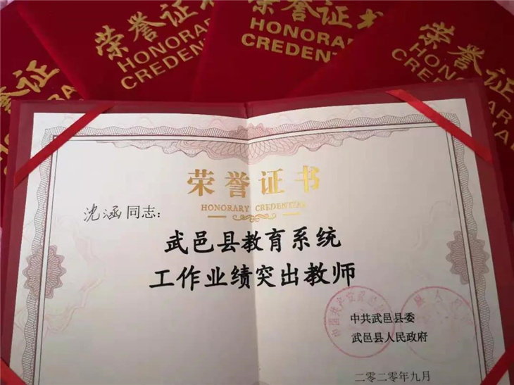 沈老师坚持学习,不断提高自己的综合素质。教学中,她潜心钻研教材,捕捉新的考向信息,经常向同学科老教师学习教学经验,借鉴优秀的教学方法,提高自己的教学能力和业务水平,荣获了“武邑县教育系统工作业绩突出教师”“星级班主任”“榜样之星”“衡水市微课大赛一等奖”等多个荣誉。