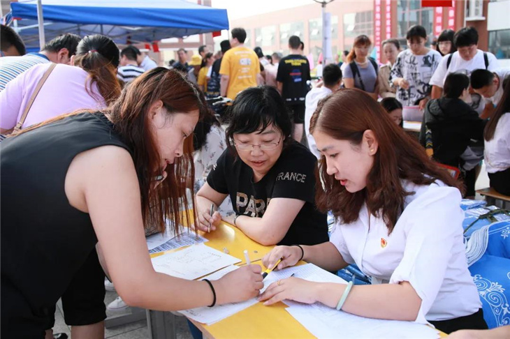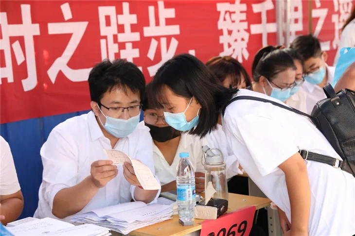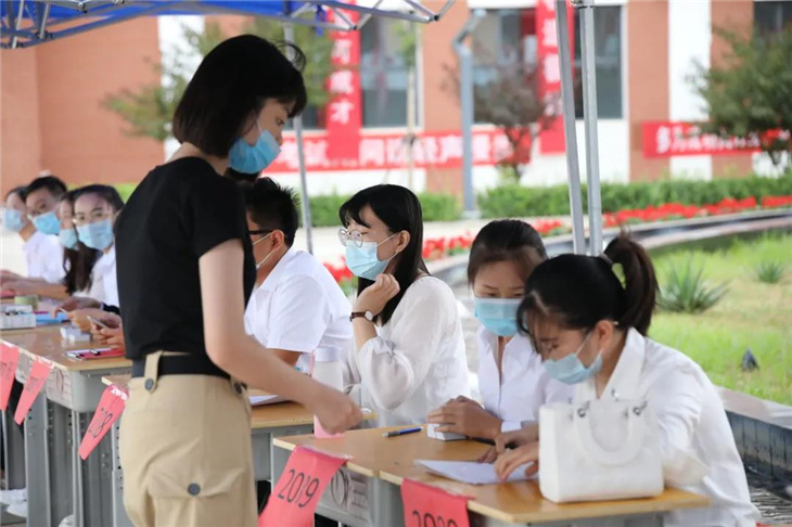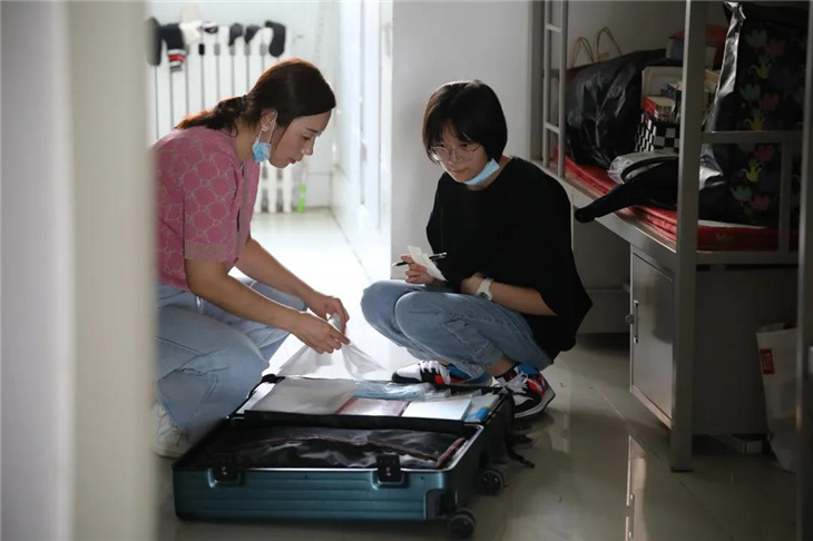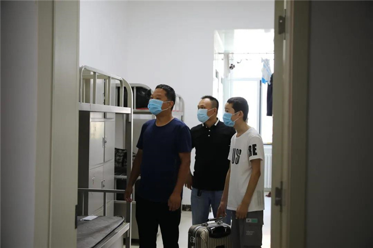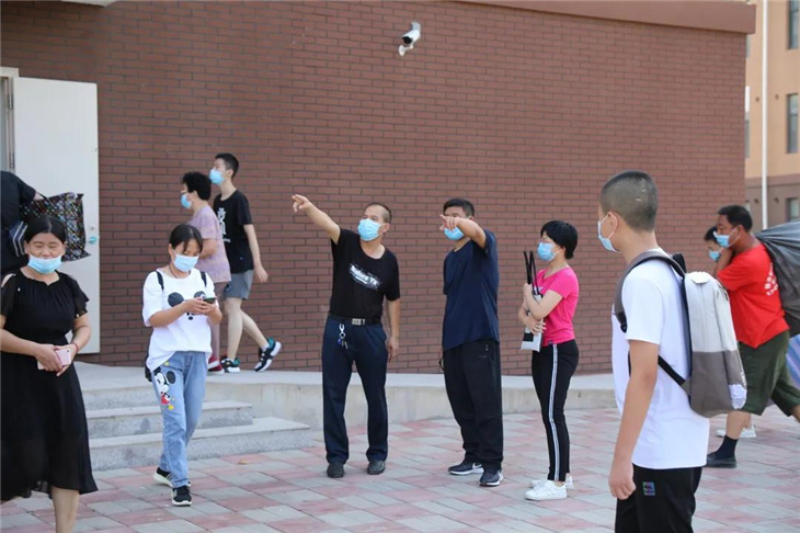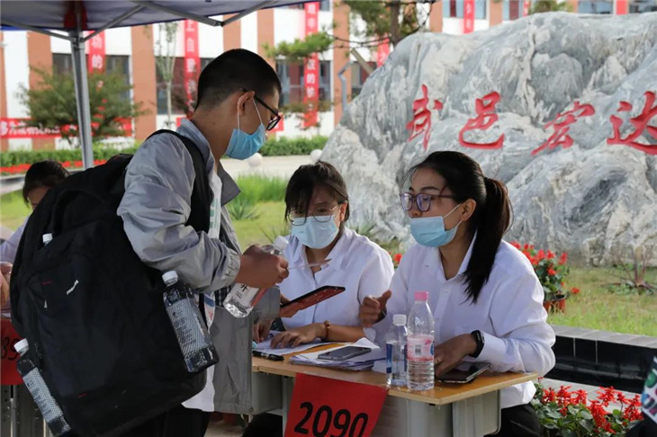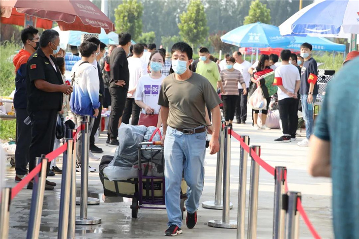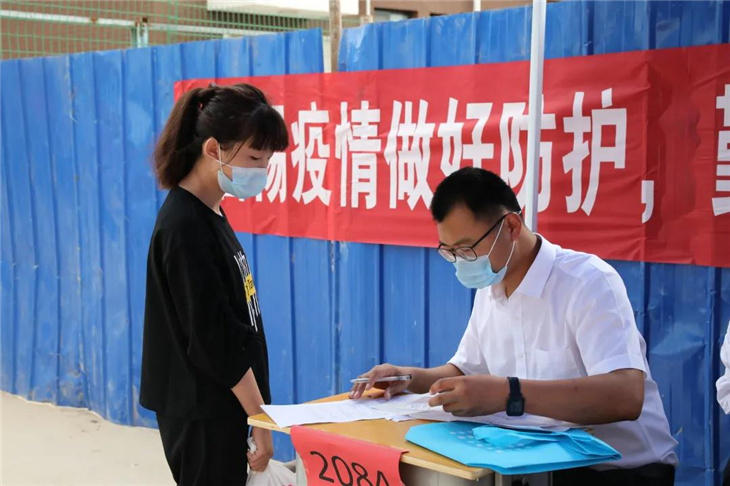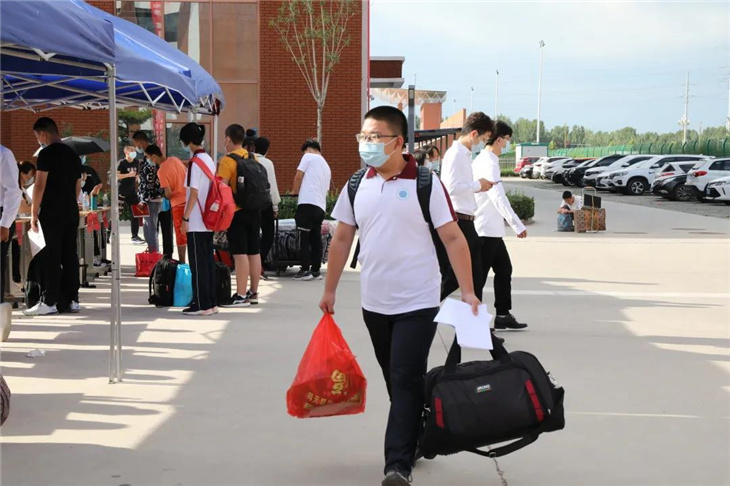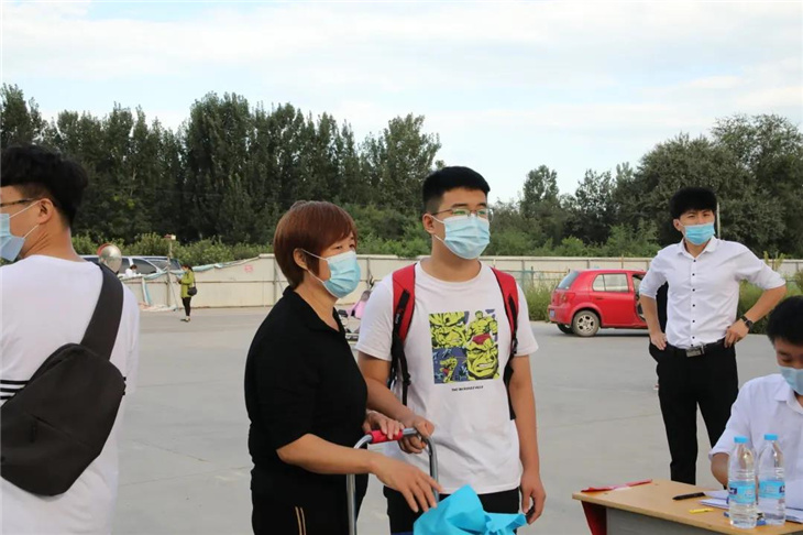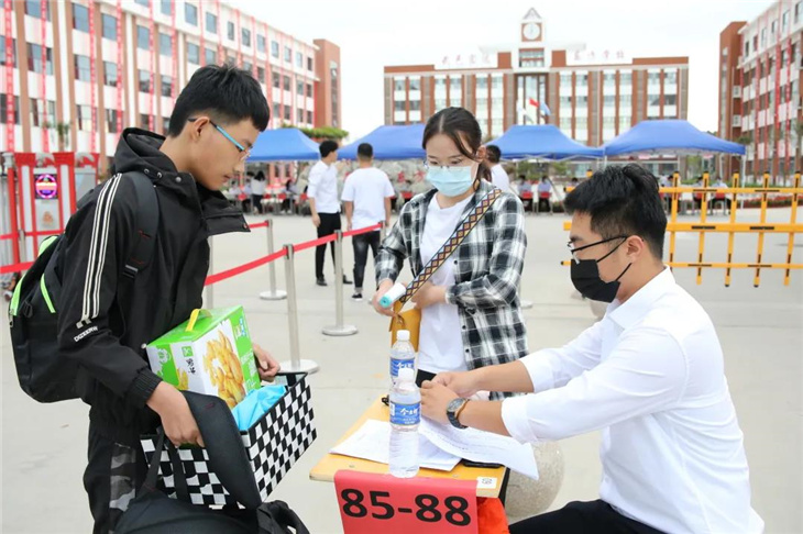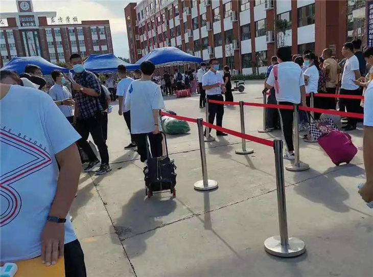 校门口有着热心的老师们测温、报名,填表,搬运行李等。
