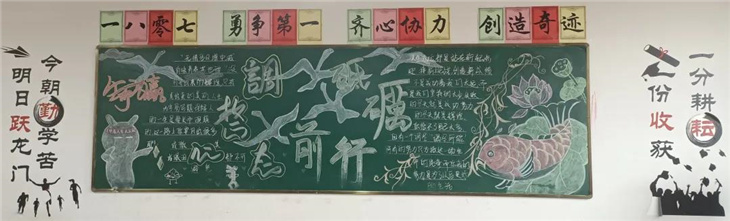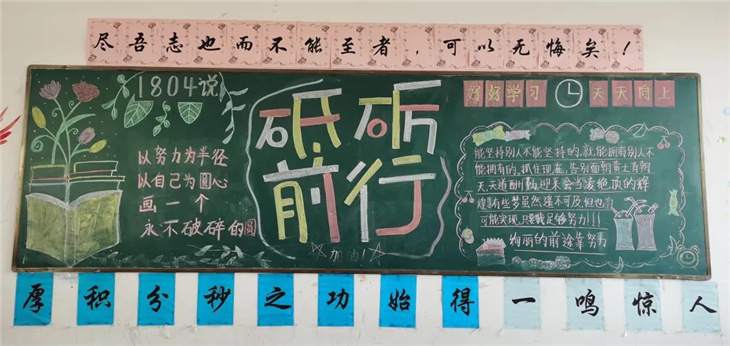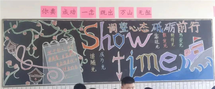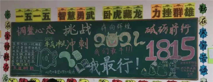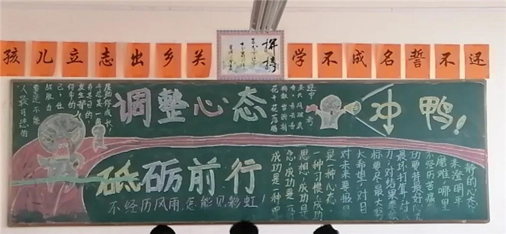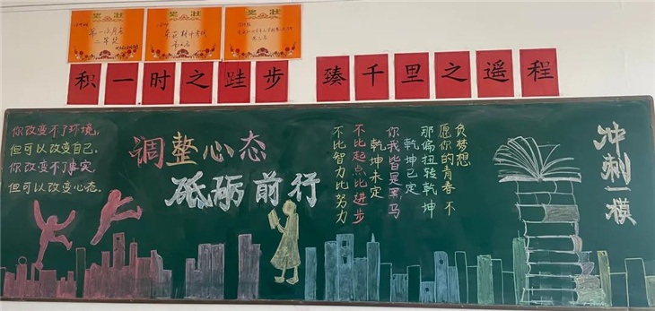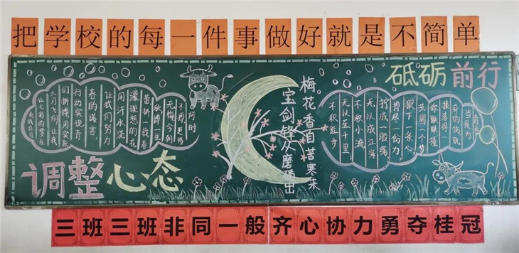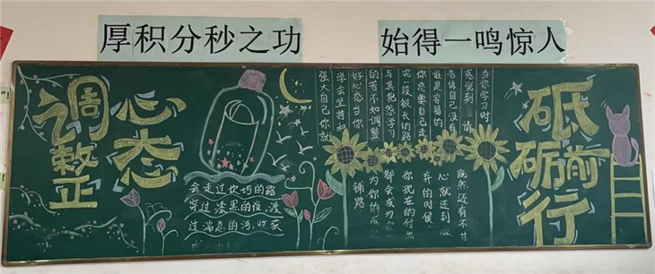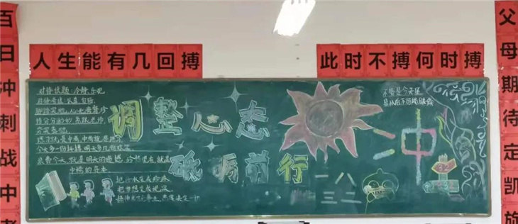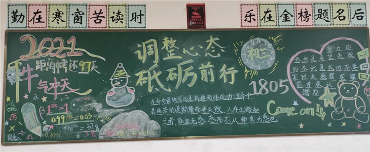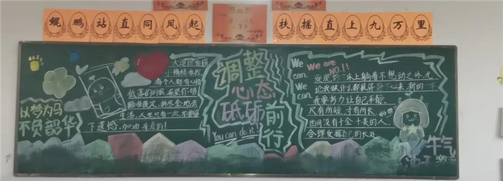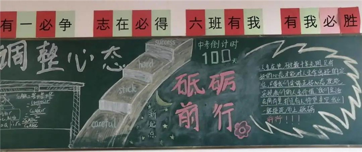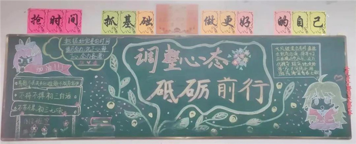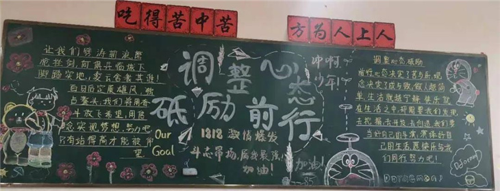 为激发学生的拼搏精神,保持良好的备考心态,初三年级各班以“调整心态,砥砺前行”为主题,设计板报,激励斗志。