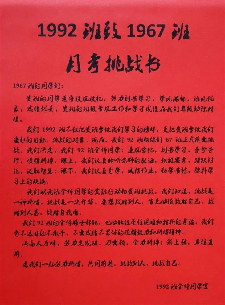 这一封封班级挑战书,书写的霸气冲天,斗志昂扬。同学们庄严的宣读战书,精神抖擞,声音洪亮,整齐划一,热血沸腾,彰显了自己饱满的精气神。