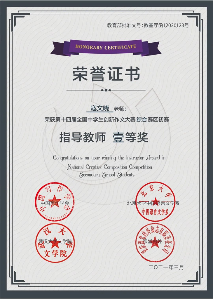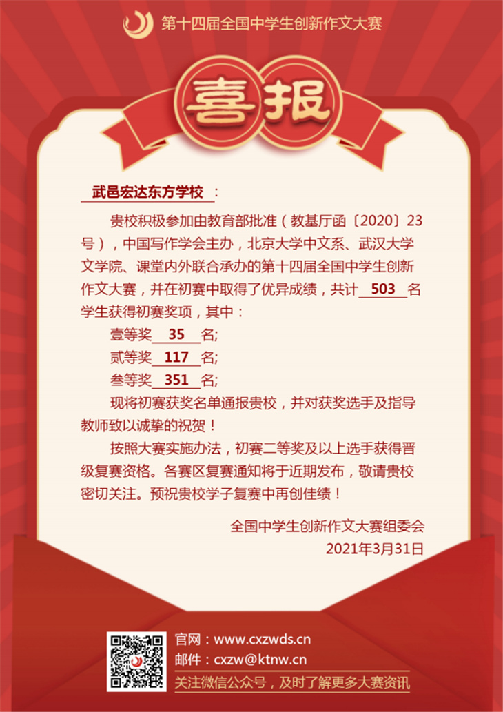 近日,全国中学生创新作文大赛组委会向我校发来获奖喜报,我校共计503名同学获得初赛奖项,其中一等奖35名,二等奖117名,三等奖351名。此外,我校语文组十七位老师也收到了大赛荣誉证书!