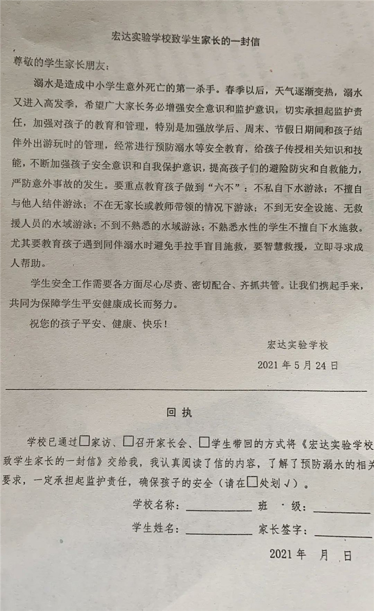 学校为家长提供有关安全注意事项书,保障学生假期的安全。