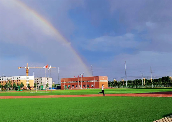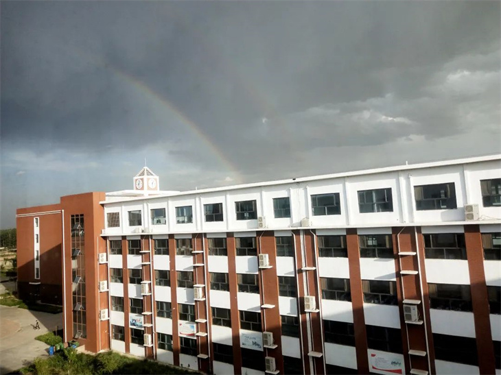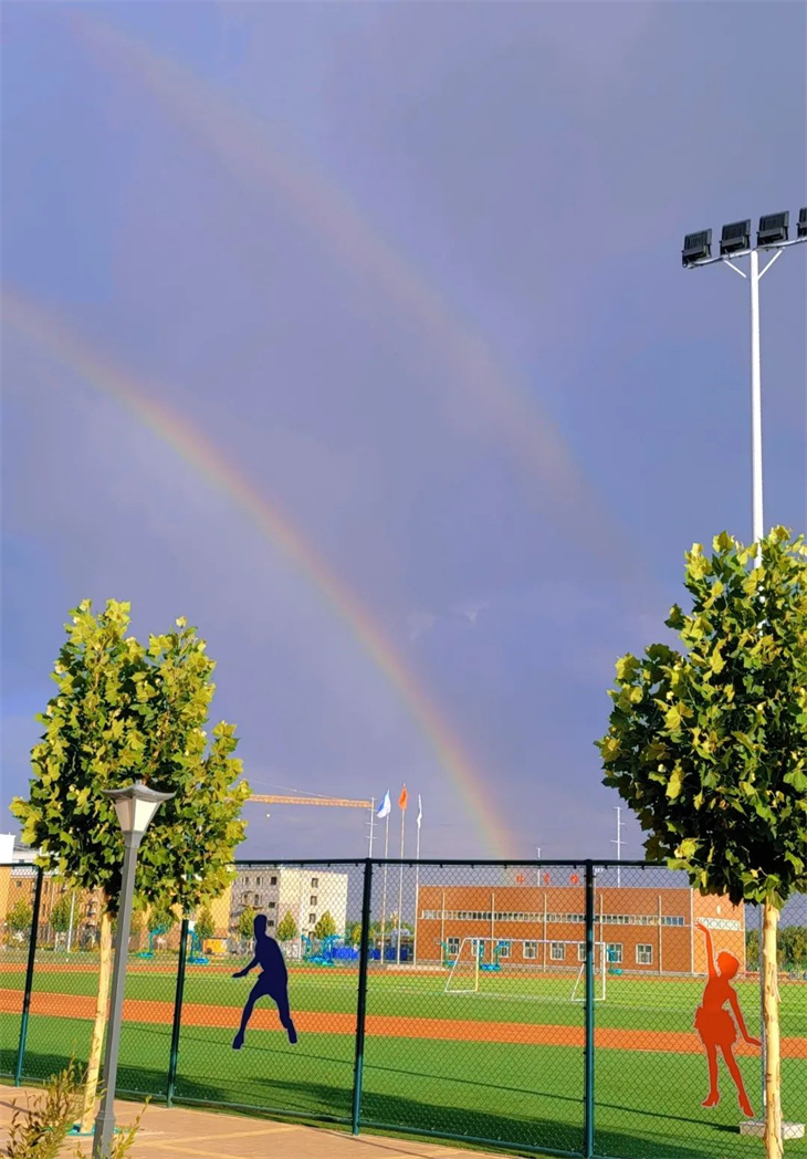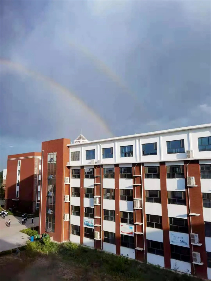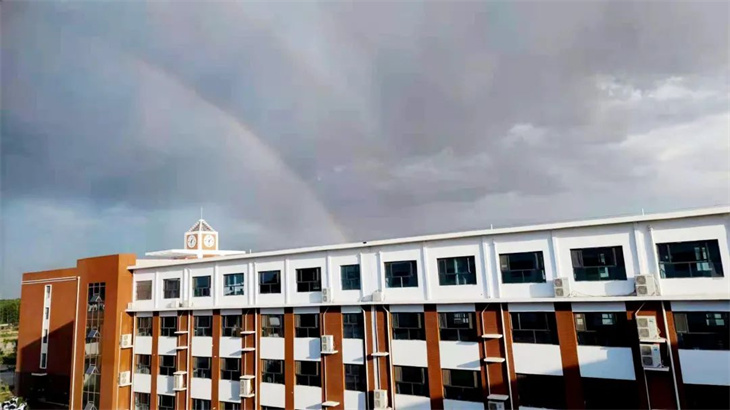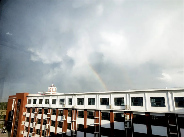是的,雷雨尚未完全退去大自然就迫不及待的亮出难得一见的绚丽双彩虹。这仿佛预示着学校的同学们在历经多番磨难后,也将变得绚丽夺目,收获满满的成就。