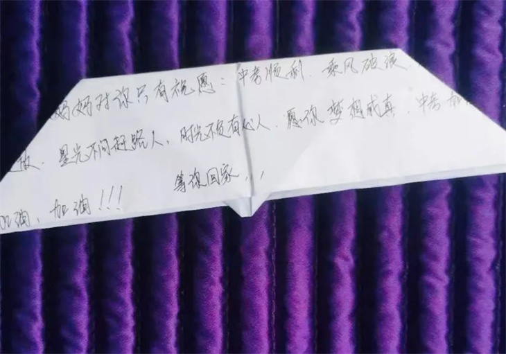 与此同时家长交给张老师一封写给儿子的信:“妈妈对你只有祝愿,中考顺利,乘风破浪,星光不负赶路人,时光不负有心人,愿你梦想成真,中考加油,加油!等你回家!”