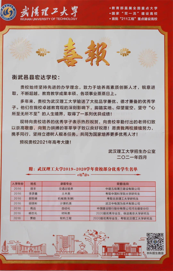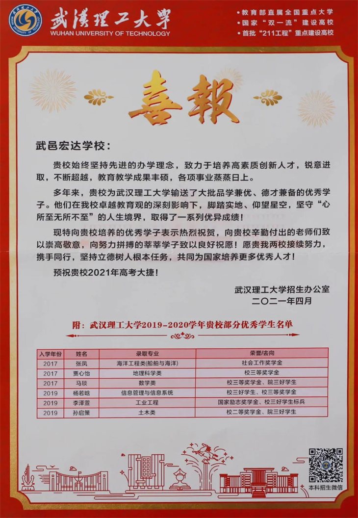 多年来,我校为武汉理工大学输送了大批品学兼优、德才兼备的优秀学子,他们在武汉理工大学脚踏实地、仰望星空,取得了一系列优异成绩。武汉理工大学校特向我校发来喜报表示热烈祝贺,向我校辛勤付出的老师致以崇高敬意,向努力拼搏的莘莘学子致以良好祝愿,希望两校继续努力,携手同行,坚持立德树人根本任务,共同为国家培养更多优秀人才!