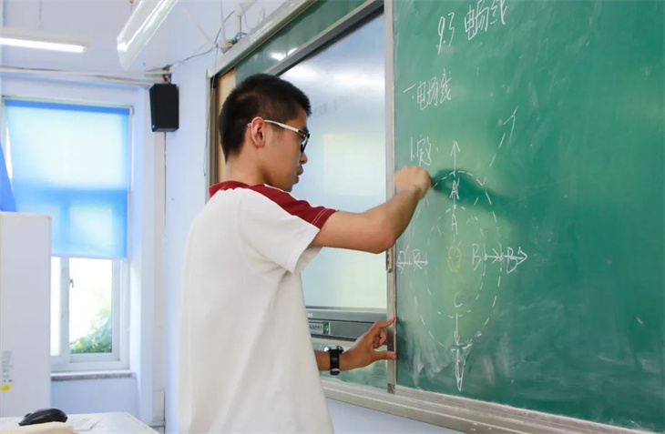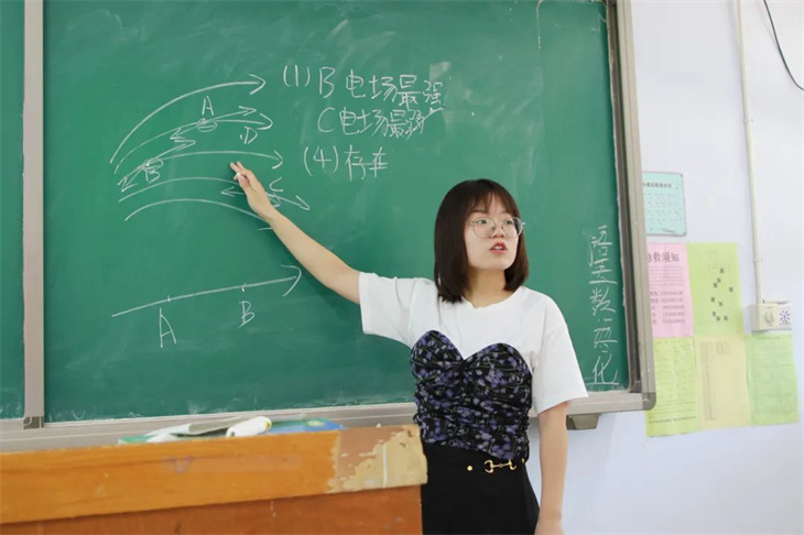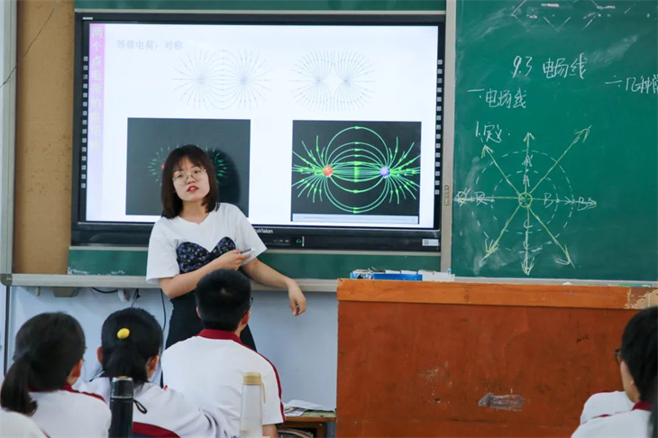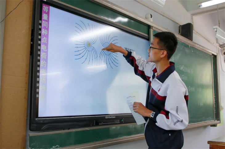 其次,通过学生进行分组讨论,通过共同探讨,总结得出电场线特点。其中,在得出等量异种电荷电场线特点后,王楚琪老师还让学生运用类似方法,讨论等量同种电荷,并让学生充当小小教师,上台进行内容讲解分享,大大提高了课堂上学生的参与度。